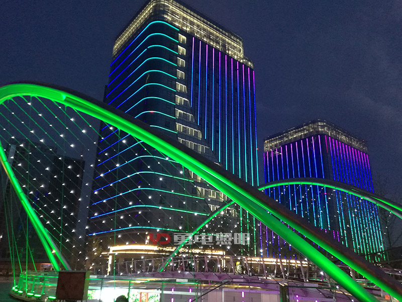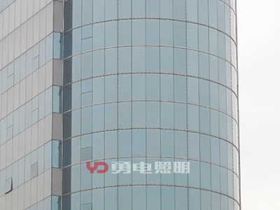 2、幕墻內(nèi)透安裝:有些幕墻玻璃顏色不深、透明性好,可以考慮將光源安裝在幕墻的內(nèi)側(cè),這種方式不會對幕墻造成任何外觀上的變化,白天隱形效果好;幕墻內(nèi)側(cè)安裝,可以用拉鋼絲繩的方式,二次封裝LED點光源設(shè)計有鋼絲卡扣,拉好鋼絲直接定好位置扣上去即可,方便快捷,不影響采光。
