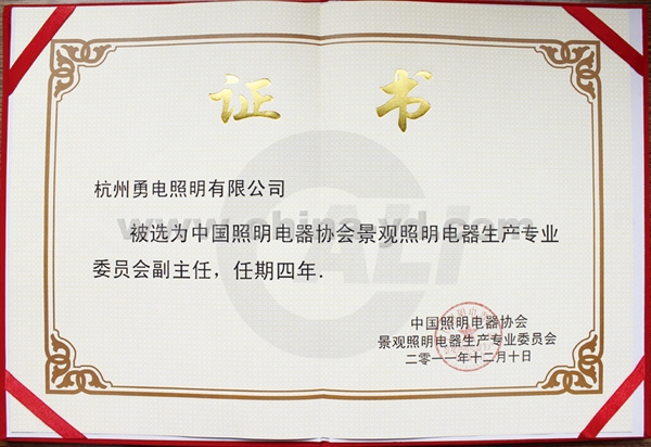我司于中國照明電器協(xié)會第一屆第一次會員大會中,被選為中國照明電器協(xié)會景觀照明電器生產(chǎn)專業(yè)委員會副主任,任期四年,特發(fā)此證。