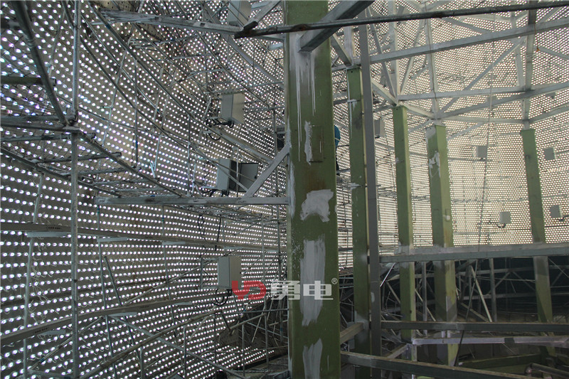 該作品主體為船形結(jié)構(gòu),鏤空部分采用定制鋼絲網(wǎng)屏,用掛鉤與船身固定。由于雕塑主體是動態(tài)活動的,會隨著表演展開和閉合,我們配置了更強(qiáng)的固定裝置以固定控制線及電源線,避免雕塑的擺動對燈具的正常運(yùn)行造成影響。