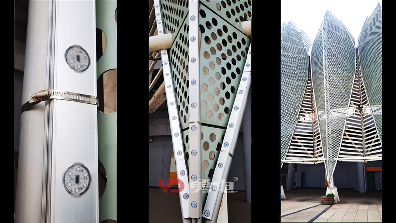 燈具采用軌道方式安裝,沿建筑造型外部鋼結(jié)構(gòu)進行“描邊”,充分突出荷花、柳葉的建筑風(fēng)韻。為迎牛年春節(jié),該項目工期緊急,施工用時僅15天,在春節(jié)前(2月7日)就完成了燈具的全部安裝!