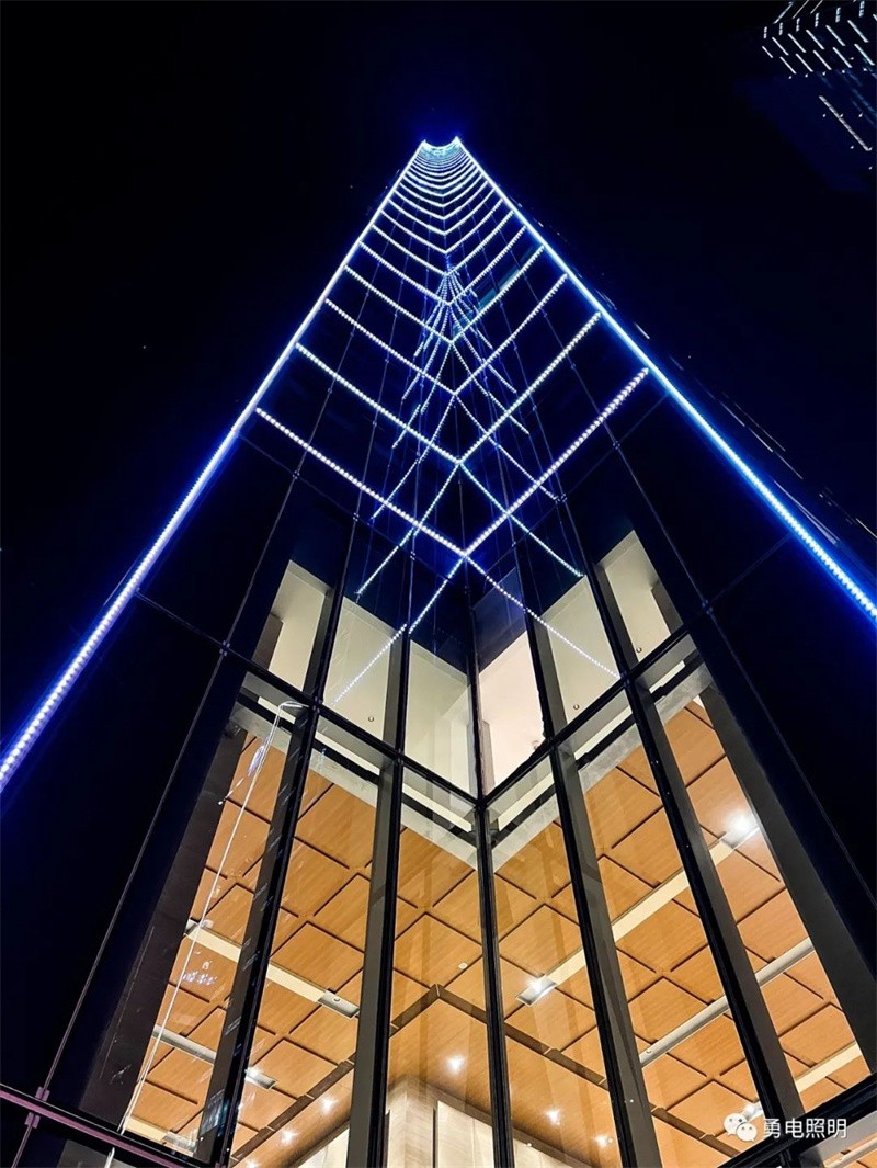 建筑立面四個(gè)角邊內(nèi)部變化復(fù)雜,幾乎每層安裝燈具的拐角直徑都不一致,加上全幕墻肌理,裝燈難度大。經(jīng)多次試燈,最終選用勇電二次封裝16*60 LED方形光源,沿幕墻鋼架采用鋁槽安裝固定,勾勒建筑拐角的橫、豎輪廓,將不規(guī)則立面用燈光連接起來。